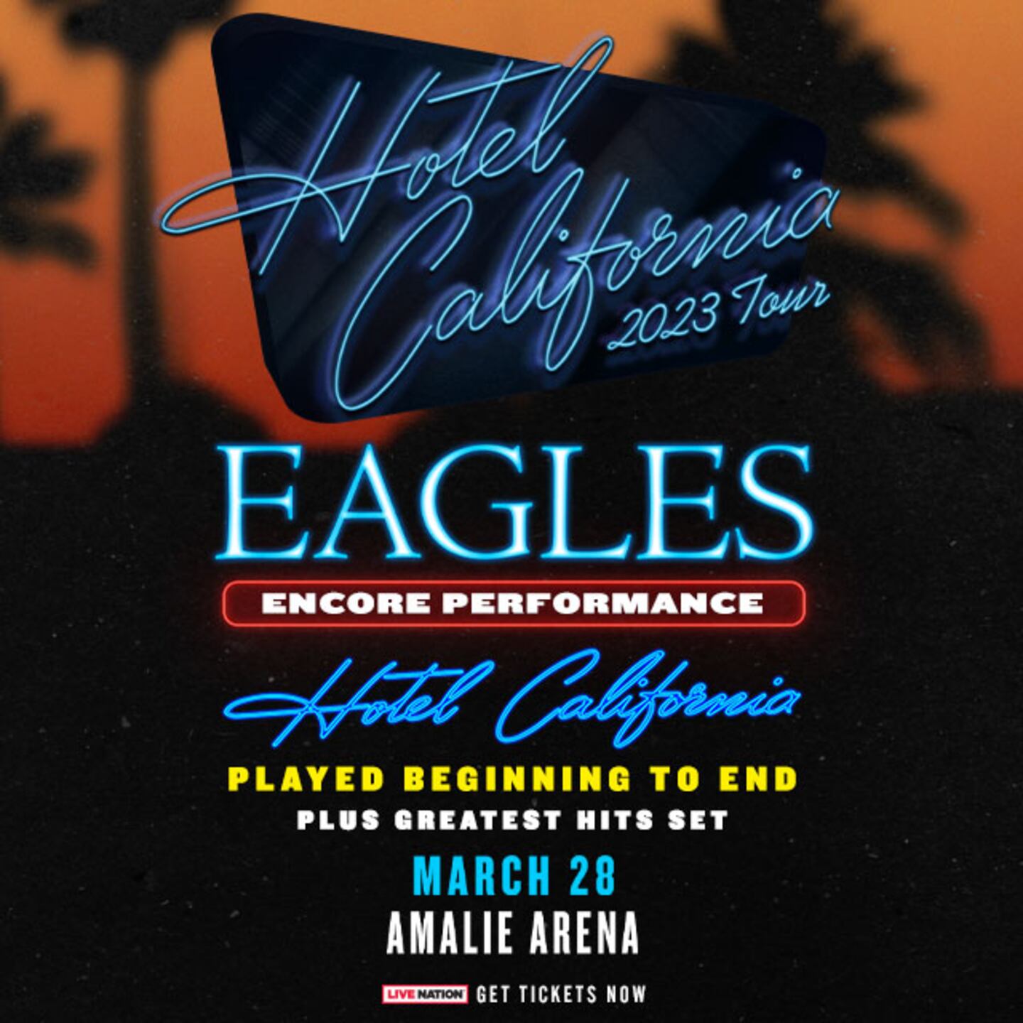 Just announced this morning, The Eagles hugely successful and sold-out Hotel California Tour returns to Florida for 2023. The tour rolls through Jacksonville March 25th, and returns to Tampa’s Amalie Arena March 28th. Tickets go on sale next Friday the 13th, 2023 at 10 am at this link.