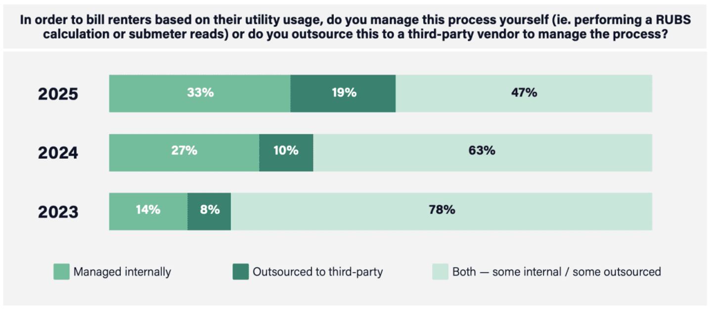 One of the main reasons property managers likely choose utilities-included rent or charge a flat monthly rate is resource strain. The end-to-end utility management process is tedious, from auditing invoices to generating bills. It can seem far easier to calculate a recurring flat fee, especially when utilities are managed in-house. Modern solutions and billing partners are highly accessible today. Digital tools and dedicated teams can assist properties with tracking usage, allocating charges, and recouping utility costs from residents. Despite this, property teams still largely manage their usage-based utility operations in-house — though third-party outsourcing has grown from 8% to 19% since 2023.