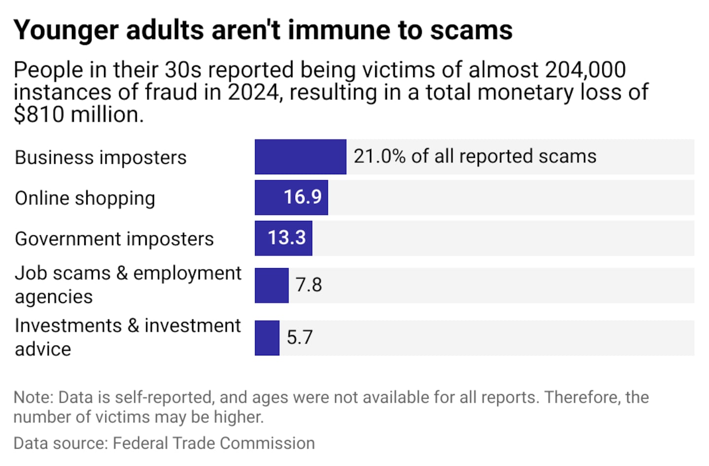 Although their financial losses weren't as high, millennials were as susceptible to scams, according to the FTC. About 1 in 3 people ages 30 to 49 reported frauds and losses in 2024, about the same likelihood as those 60 or older.