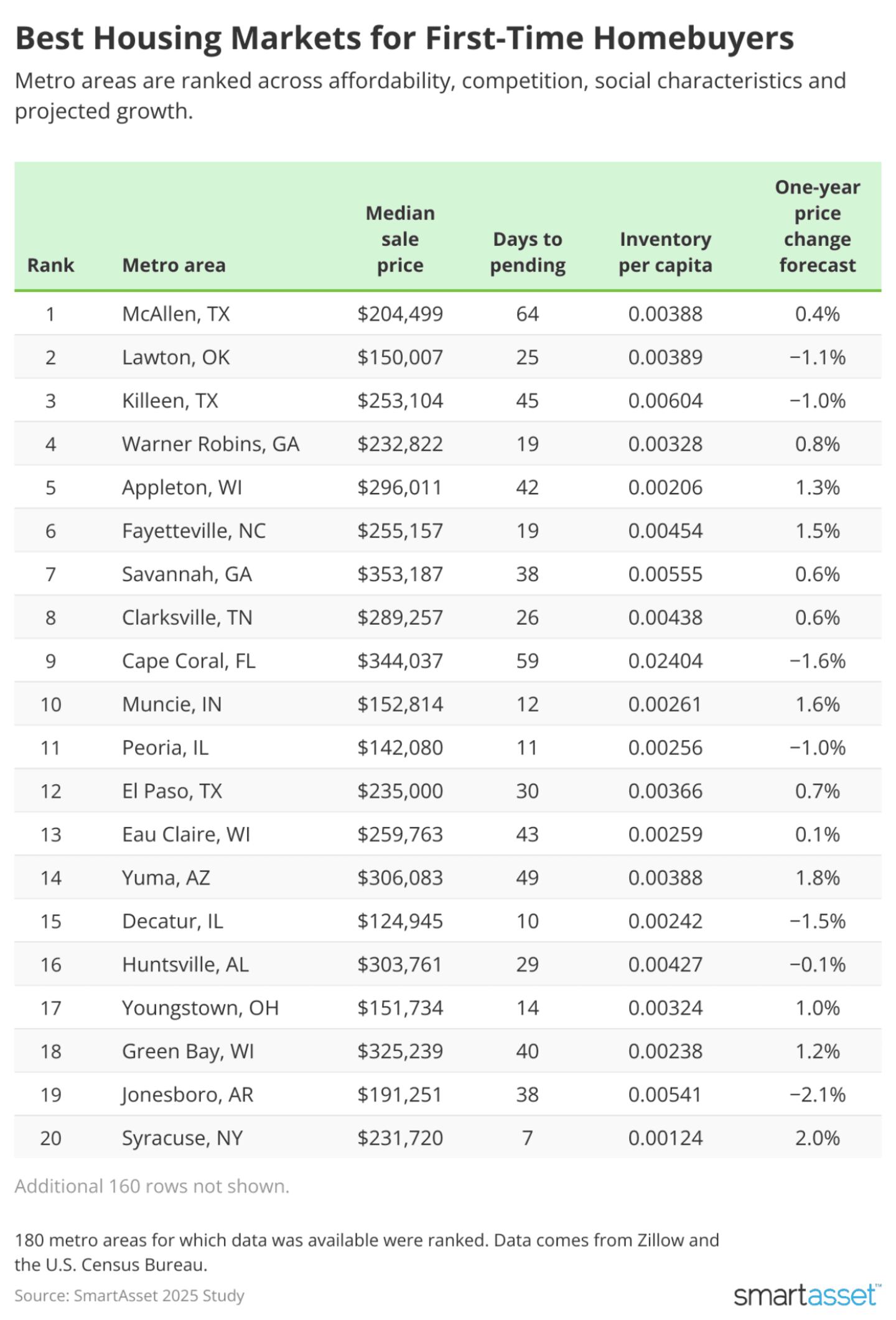 • McAllen, TX is the best metro area for first-time homebuyers in 2025. After ranking fourth last year, McAllen has replaced Lawton, OK as the number one metro area for hopeful homeowners. In particular, it offers positive projected home-price growth over the next year, moderate affordability with the median sale price of $204,499 being about four times as much as the median local income, and a market that allows potential buyers to take their time to make a decision before putting in an offer.
