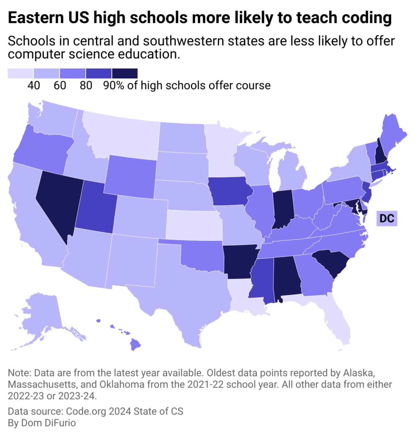 When the global pandemic accelerated digital transformation, the demand for skilled workers in the tech fields rose even more, especially for those in computer science and coding. In 2024, 3 in 5 high schools offered foundational computer science courses, and 11 states required computer science credit for graduation, according to the latest annual report from advocacy group Code.org.