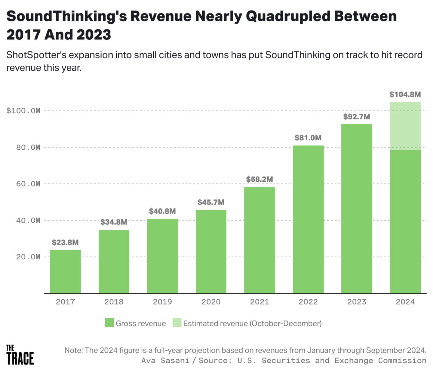 ShotSpotter is present in more than 170 cities, communities, counties, and university campuses, according to SoundThinking. Filings with the U.S. Securities and Exchange Commission indicate that the expansion into small cities and towns has caused ShotSpotter's coverage area to more than double over the past eight years. Meanwhile, SoundThinking's revenue has quadrupled from $24 million in 2017 to $93 million in 2023. The company is on track to hit record revenue this year.