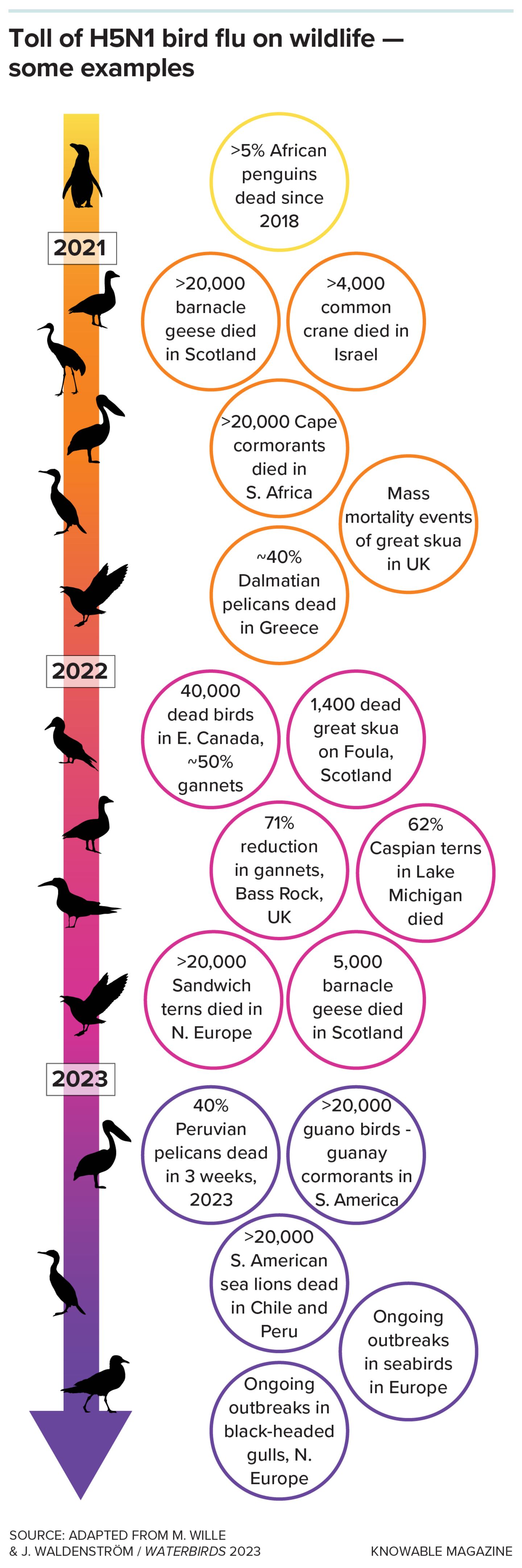 Wild birds have been affected around the world, and even waterbirds, which normally harbor influenza A without symptoms, have suffered. Though a full census is lacking, individual examples are sobering. The population of great skuas, found primarily in Scotland, is down by a reported 75 percent. An outbreak in California condors in 2023 killed 21 animals, in a species with fewer than 1,000 in existence. "An event like that could change the course of a species," says Wille. "Are they going to come back or not?"