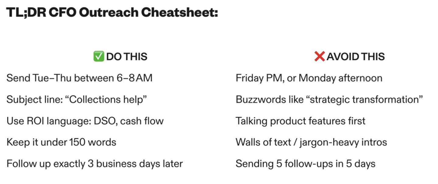 • Use clear subject lines like "Collections help" — something specific to a CFO's executive responsibilities.