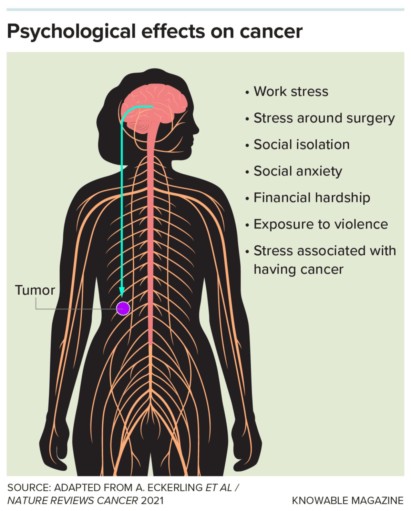 In recent decades, scientists have approached the problem from another angle: experiments in cells and animals. These have revealed important mechanisms by which stress can alter tumors, says Julienne Bower, a health psychologist at UCLA who coauthored a 2023 article on the connection between the brain and the immune system in diseases, including cancer, in the Annual Review of Clinical Psychology. Such studies are showing that "psychological factors can influence aspects of actual tumor biology," she says. On the flip side, studies in people and animals suggest that blocking the chemical signals of stress may improve cancer outcomes.