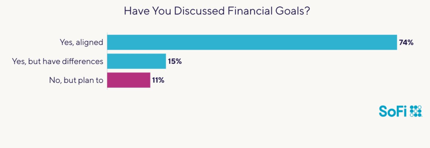 The participants in the SoFi survey seem to be on the right track: Three-quarters said they freely discuss finances with their partner. Another 18% are somewhat comfortable having money talks, while around 6% are either neutral or somewhat uncomfortable. Better yet: Not even one survey respondent said they were very uncomfortable discussing finances with their future spouse.