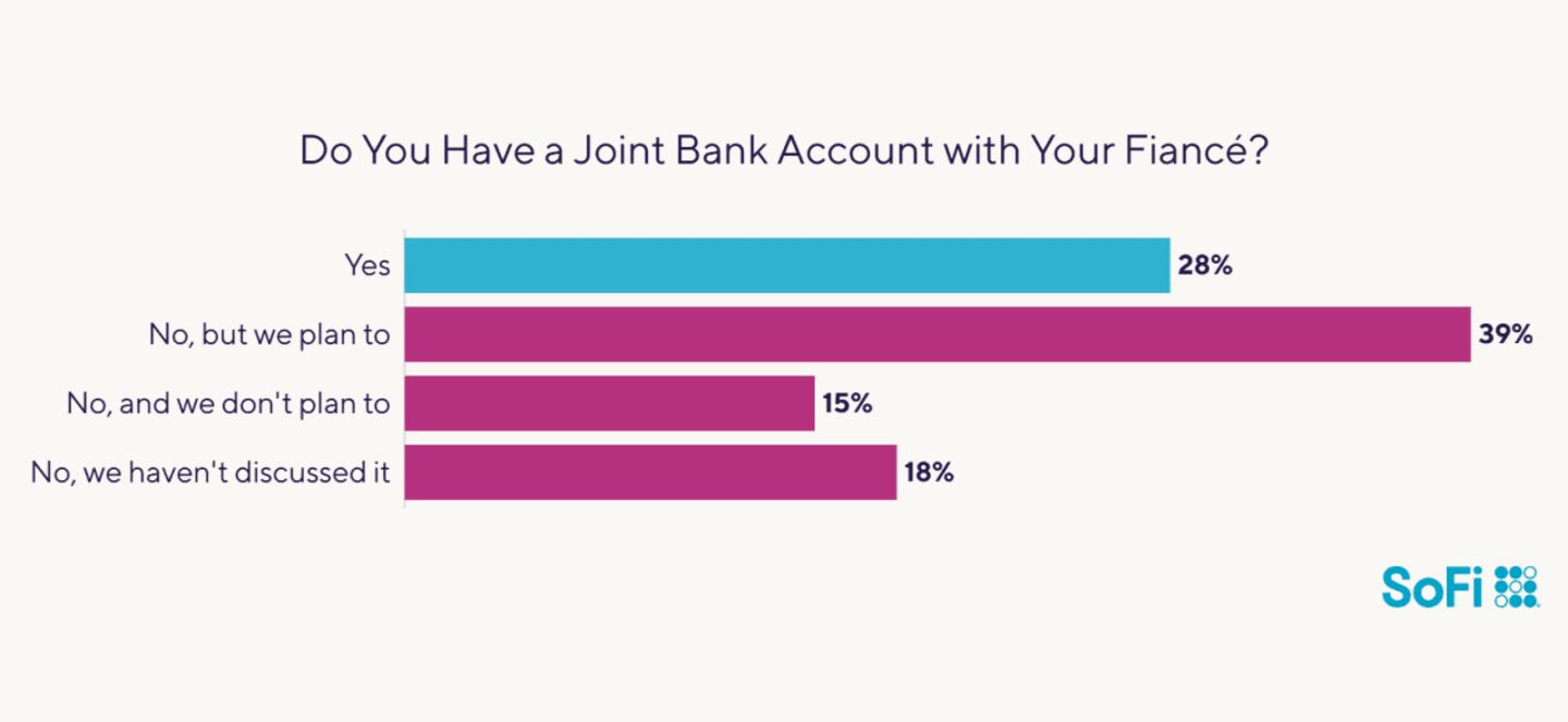 A joint bank account can make it easier for couples to manage household bills and other shared expenses. That may explain why, even before they tie the knot, nearly 30% of respondents have a joint account with their significant other, and 39% are planning to open an account together.