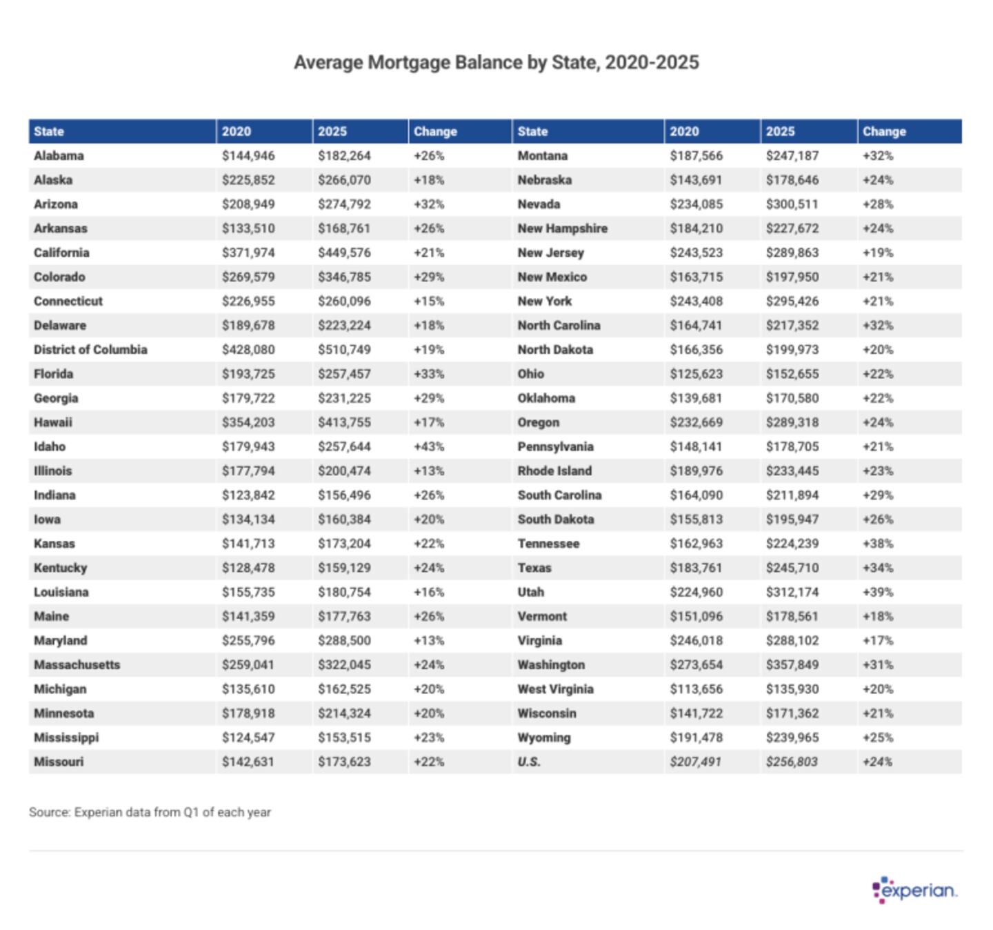 Looking at mortgage balances first, the average mortgage balance has increased 24% nationwide since 2020, from $207,491 to $256,803 in 2025. Most states in the U.S. saw increases close to the national average.