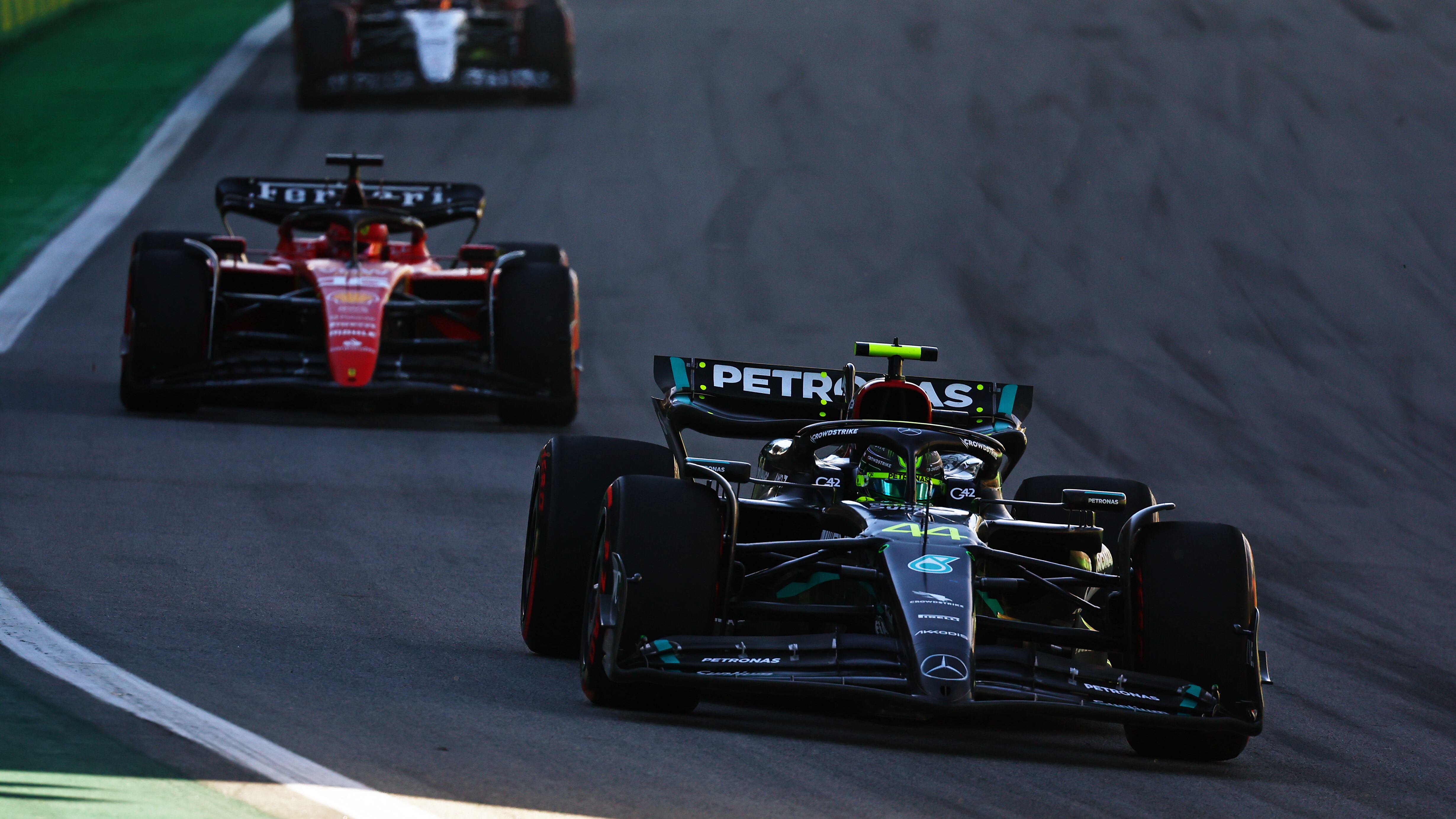F1 Grand Prix of Brazil - Sprint SAO PAULO, BRAZIL - NOVEMBER 04: Lewis Hamilton of Great Britain driving the (44) Mercedes AMG Petronas F1 Team W14 leads Charles Leclerc of Monaco driving the (16) Ferrari SF-23 on track during the Sprint ahead of the F1 Grand Prix of Brazil at Autodromo Jose Carlos Pace on November 04, 2023 in Sao Paulo, Brazil. (Photo by Mark Thompson/Getty Images) (Mark Thompson/Getty Images)