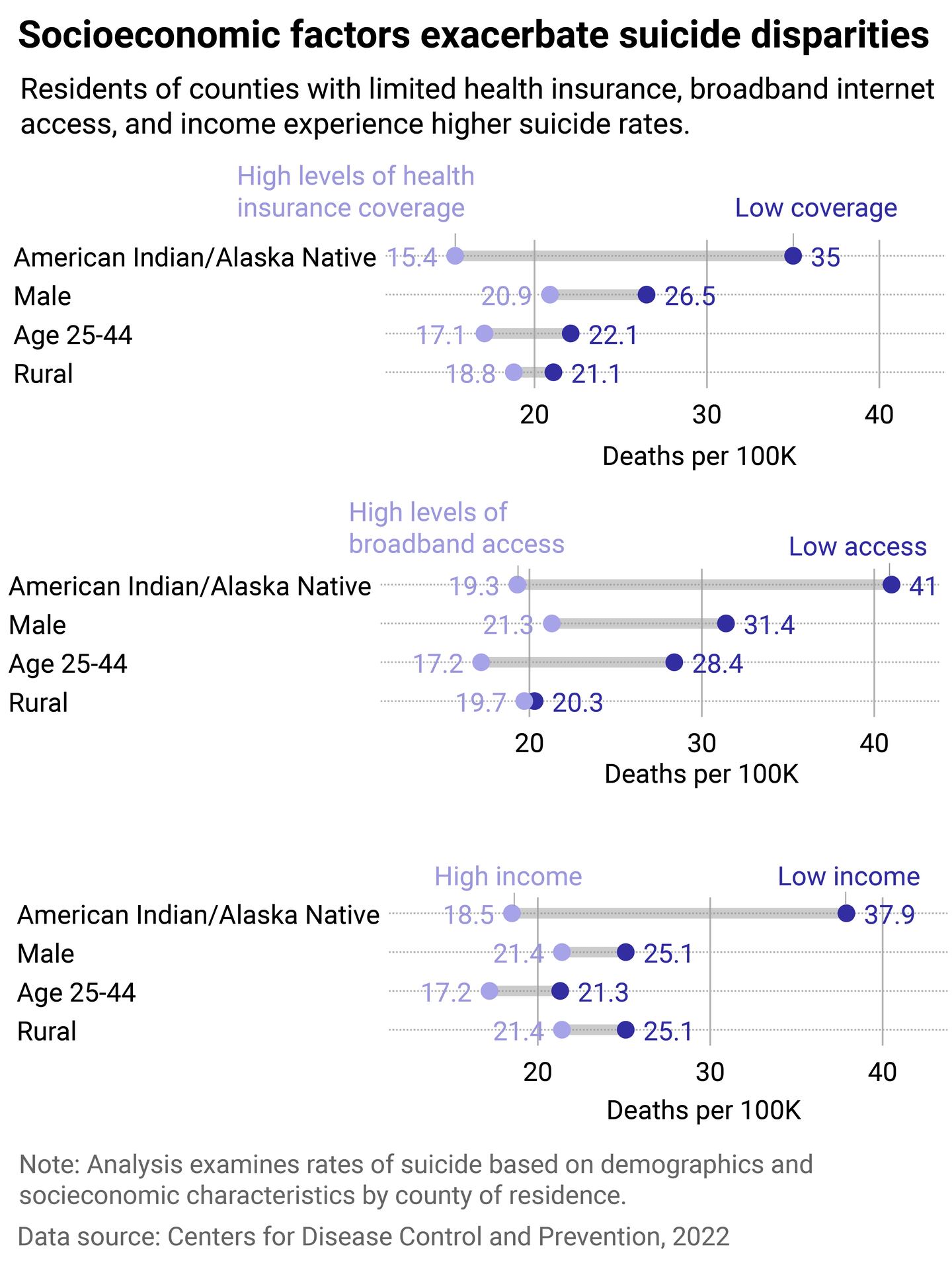 Suicides are 26% lower in counties with the highest health insurance coverage, 44% lower in areas with better broadband internet access, and 13% lower in those with higher household incomes. "Improving the conditions where people are born, grow, live, work, and age is an often overlooked aspect of suicide prevention," said Alison Cammack, health scientist and lead author of the CDC report. Cammack also pointed out that localized programs "can help people avoid reaching a crisis point."