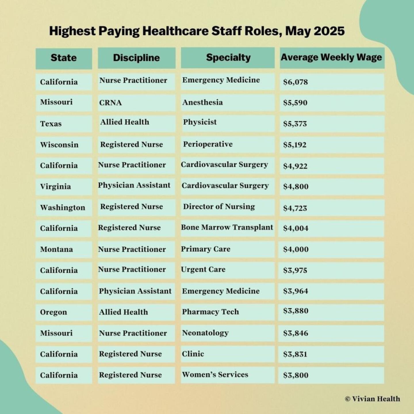 Vivian analyzed internal salary data based on actual jobs posted by health systems and staffing agencies over the last month to preview some of the highest-paying staff or travel healthcare jobs in various states across the nation.