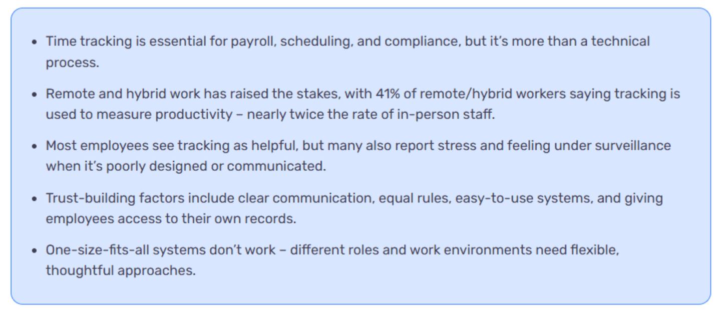 This research shows employees want systems that are fair, transparent, and designed with their real work in mind. When tracking is clear, consistent, and flexible, it helps people get paid accurately, plan their days, and feel valued. Done poorly, it adds stress, breeds resentment, and undermines the very productivity it aims to support.