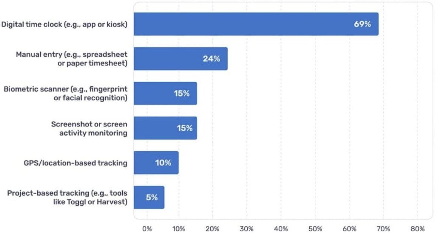 According to the survey, digital time clocks dominate the landscape, with nearly seven in ten workers saying they use an app, kiosk, or automated system to track their time at work. This shift reflects the push to move beyond old-school timesheets toward AI-powered systems that reduce repetitive data entry, improve accuracy, and give leaders real-time insights for better planning.