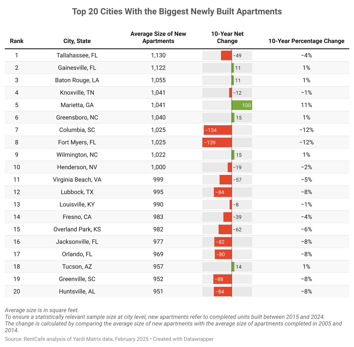 Southern destinations offer the most generous apartment sizes, giving renters additional breathing room. Among 100 cities surveyed, Tallahassee, Florida, tops the list, with new apartments built in the past decade averaging 1,130 square feet.