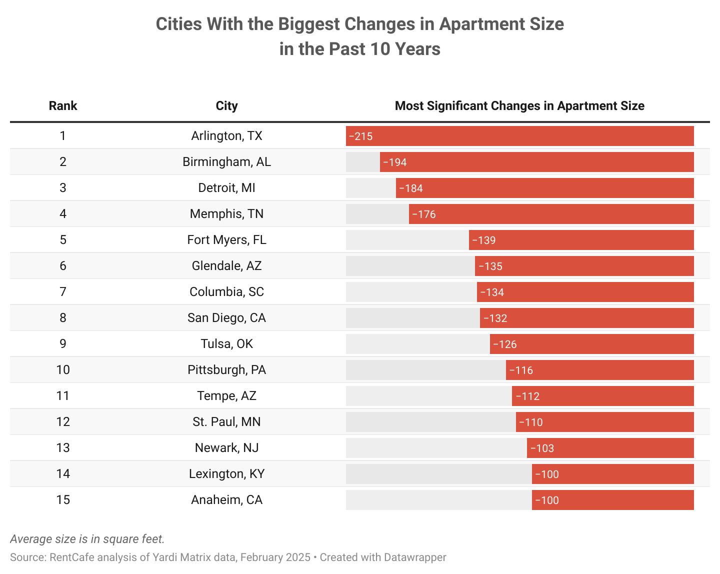 Apartment sizes are also shrinking for renters in Birmingham, Alabama, and Detroit, where living space decreased by 194 and 184 square feet, respectively. Other cities experiencing noticeable shrinking in apartment size include Memphis, Tennessee, (down 176 square feet), and Fort Myers, Florida, (down 139 square feet).