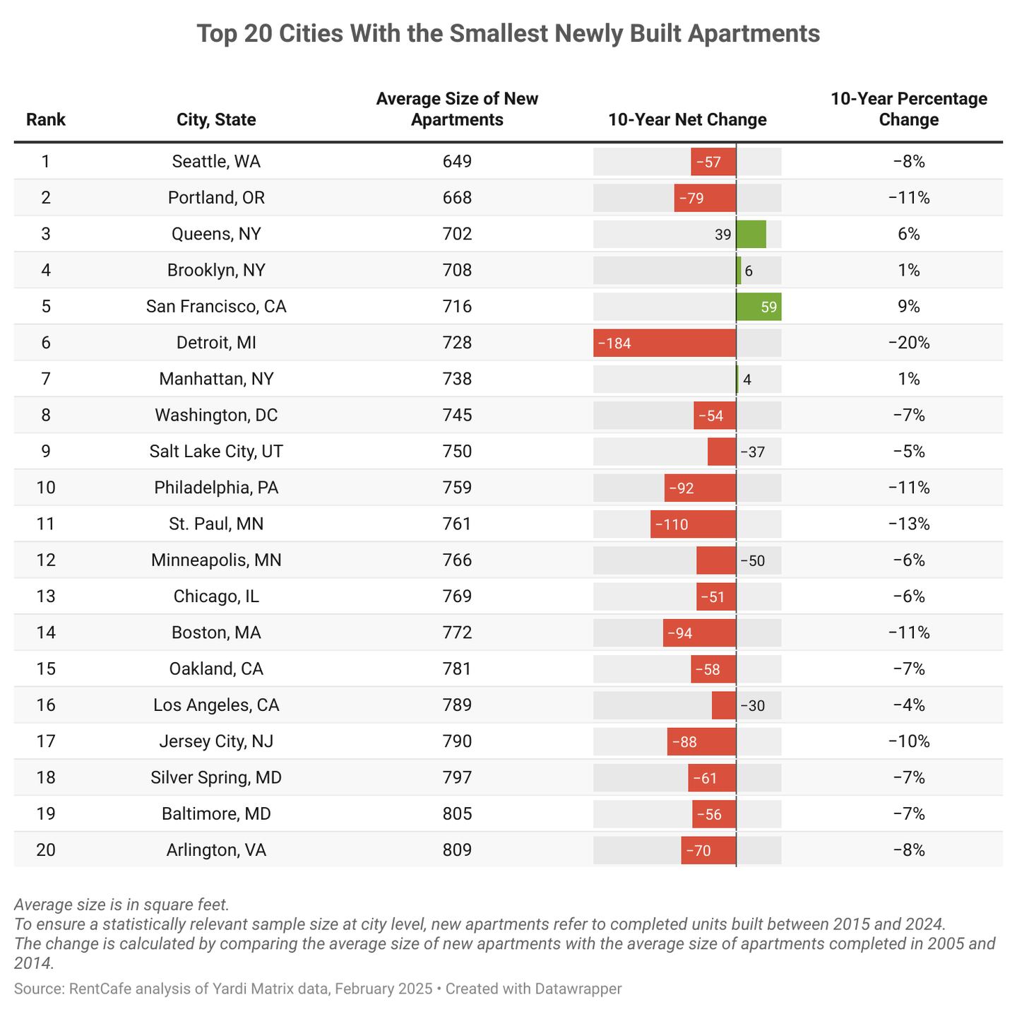 - Seattle remains the city with the smallest apartment size in the U.S.