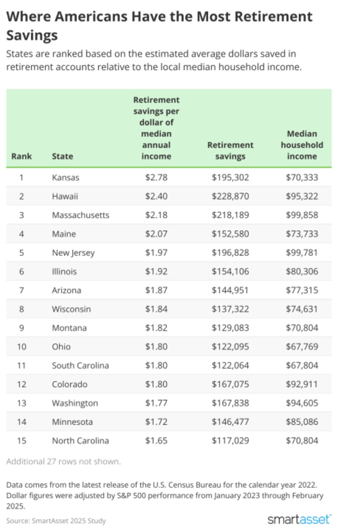 This study from SmartAsset examined retirement savings and net worth data released July 2024 by the U.S. Census Bureau reflecting the 2022 calendar year. Dollar figures were adjusted to 2025 dollars based on S&P 500 gains of 52.58% between January 2023 and February 2025 according to Of Dollars and Data's S&P 500 Calculator. Median household income comes from the U.S. Census Bureau for 2023.