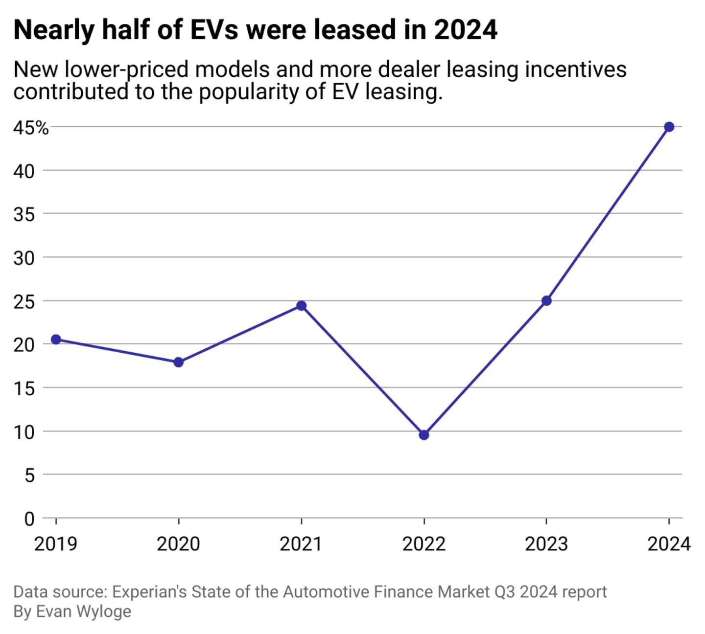 EVs accounted for 17.3% of all new leases in 2024 and grew 30% compared to 2023. Nearly 45% of new EV transactions were leasing, a continued rise from just about 25% in 2023 and 10% in the third quarter of 2022.