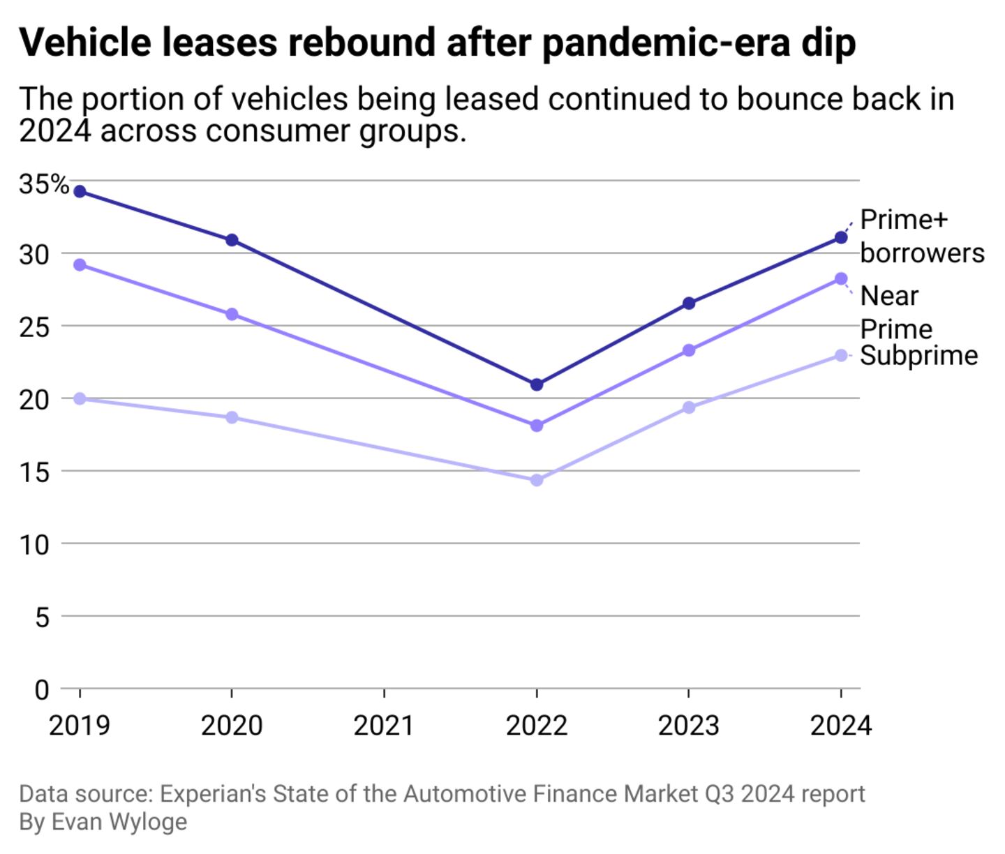 For many Americans, access to a personal vehicle is a necessity, but like most other consumer goods, the price of owning one has risen. Last year, car buyers sought to lease vehicles instead of obtaining traditional car loans, with the former option accounting for about 25% of new vehicle purchases, according to Experian's State of the Automotive Finance Market Q3 2024 report.